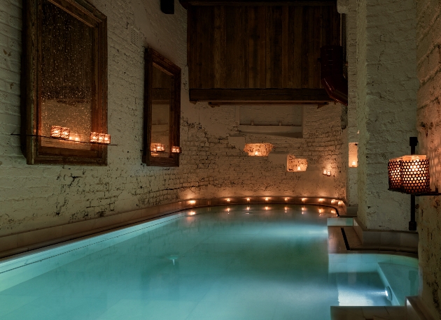 As we wandered down candle-lit stairs, we emerged into the softly lit main area with a relaxing atmosphere highlighted by the calming music and the sound of water. The rustic space features exposed brickwork, a labyrinth of pools, brown leather Chesterfield sofas and wooden accents.